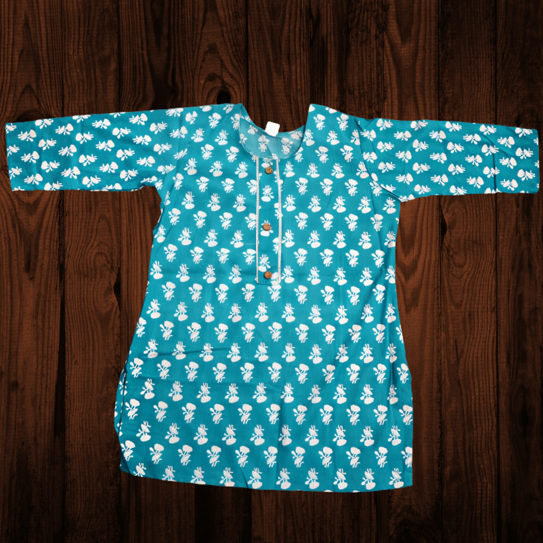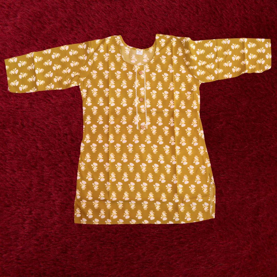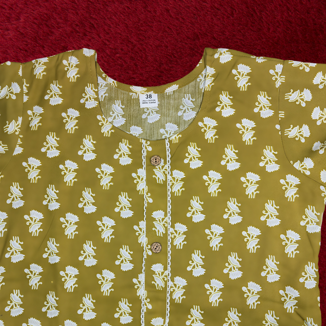 Short Kurti This kurti features a fresh floral print and a relaxed silhouette, crafted from soft and breathable fabric for everyday elegance. It’s designed with delicate button details and subtle lacework along the placket for a charming finish — ideal for casual wear or light festive occasions.